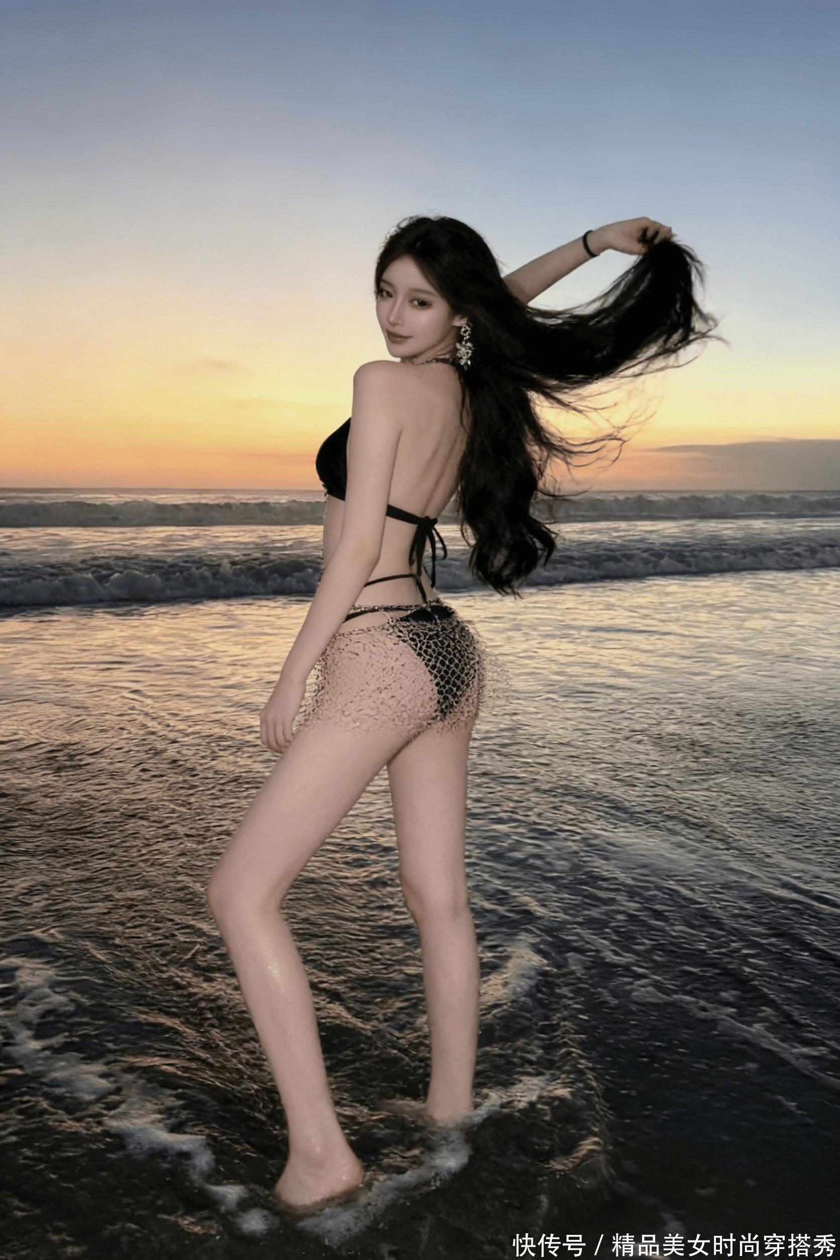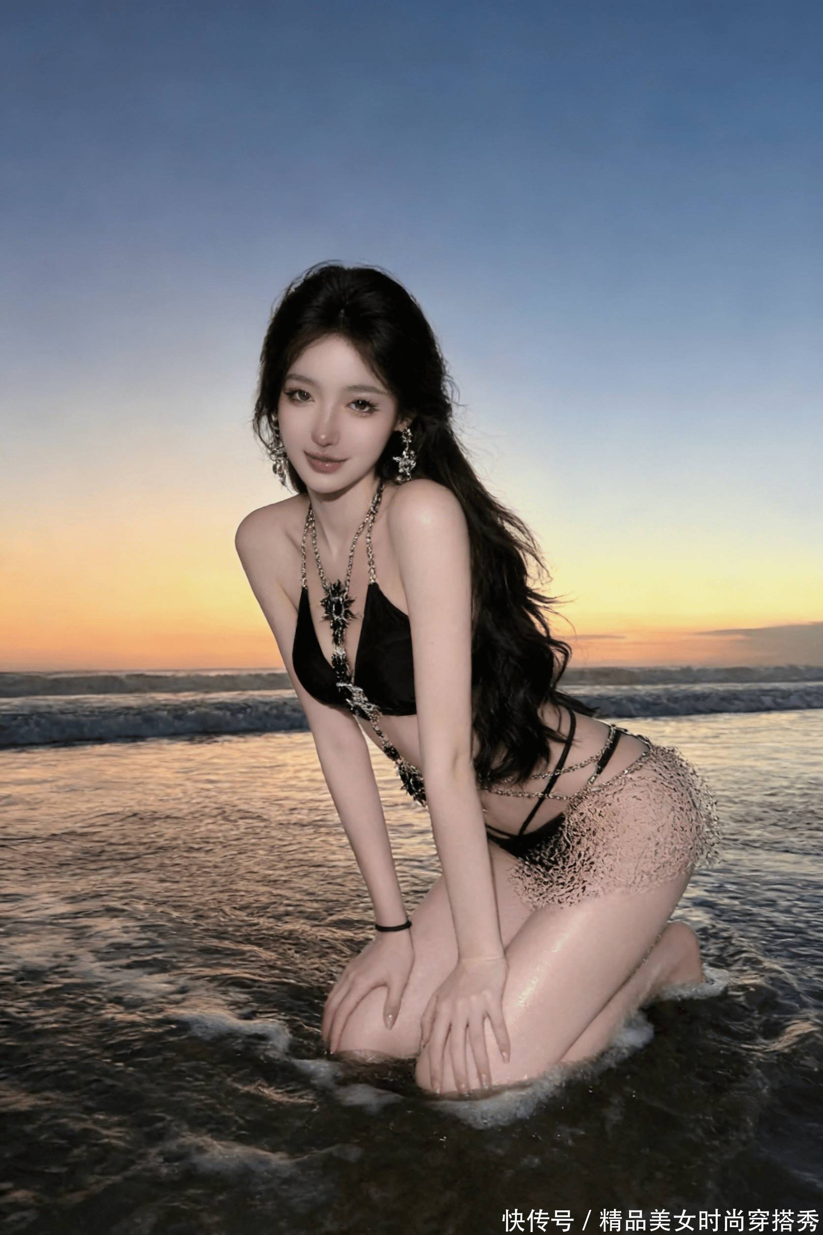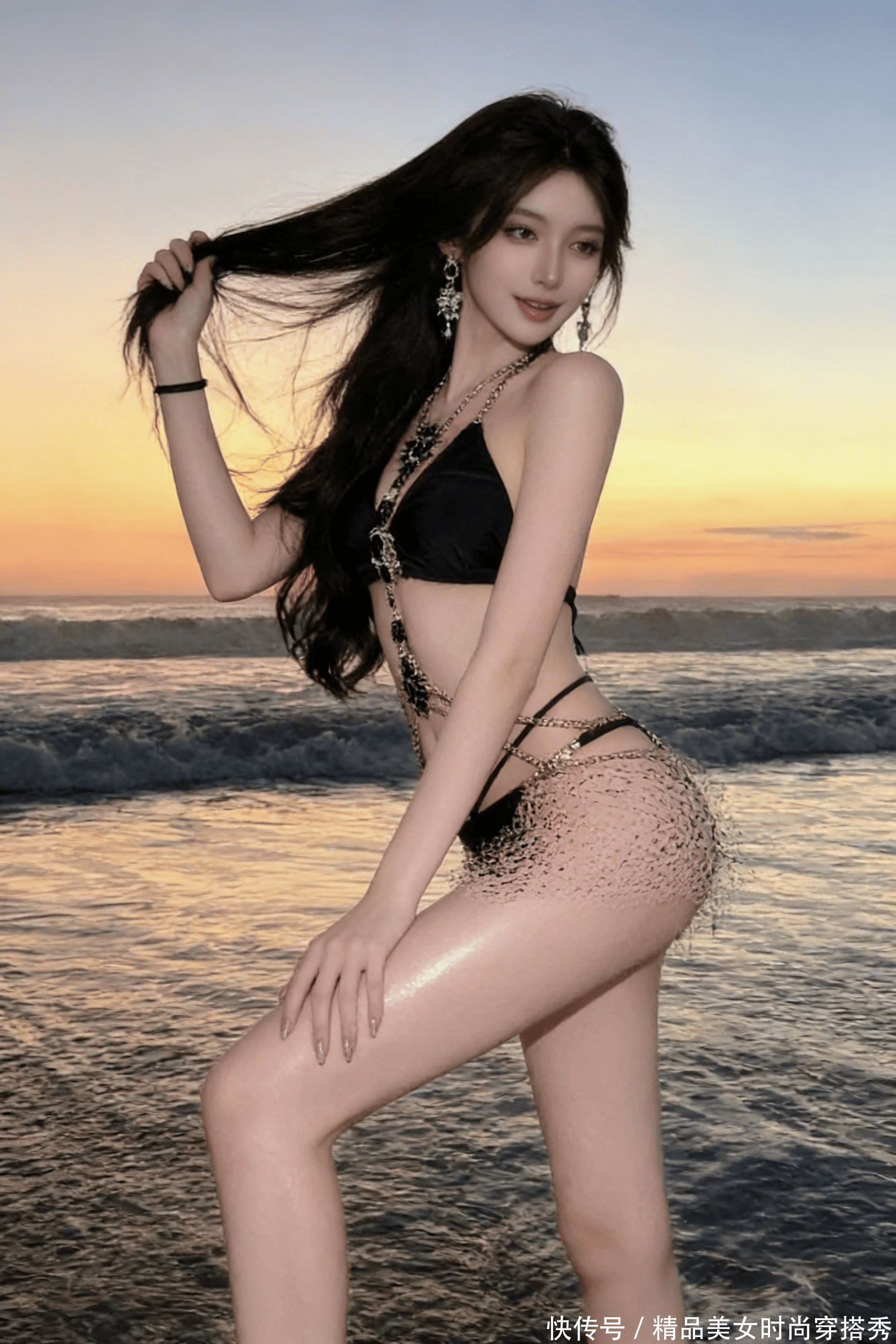 黑色比基尼衬得肌肤白到发光,重工链条在余晖里闪着冷艳的碎光,侧边的蕾丝随浪轻晃,更添几分柔媚与勾人。